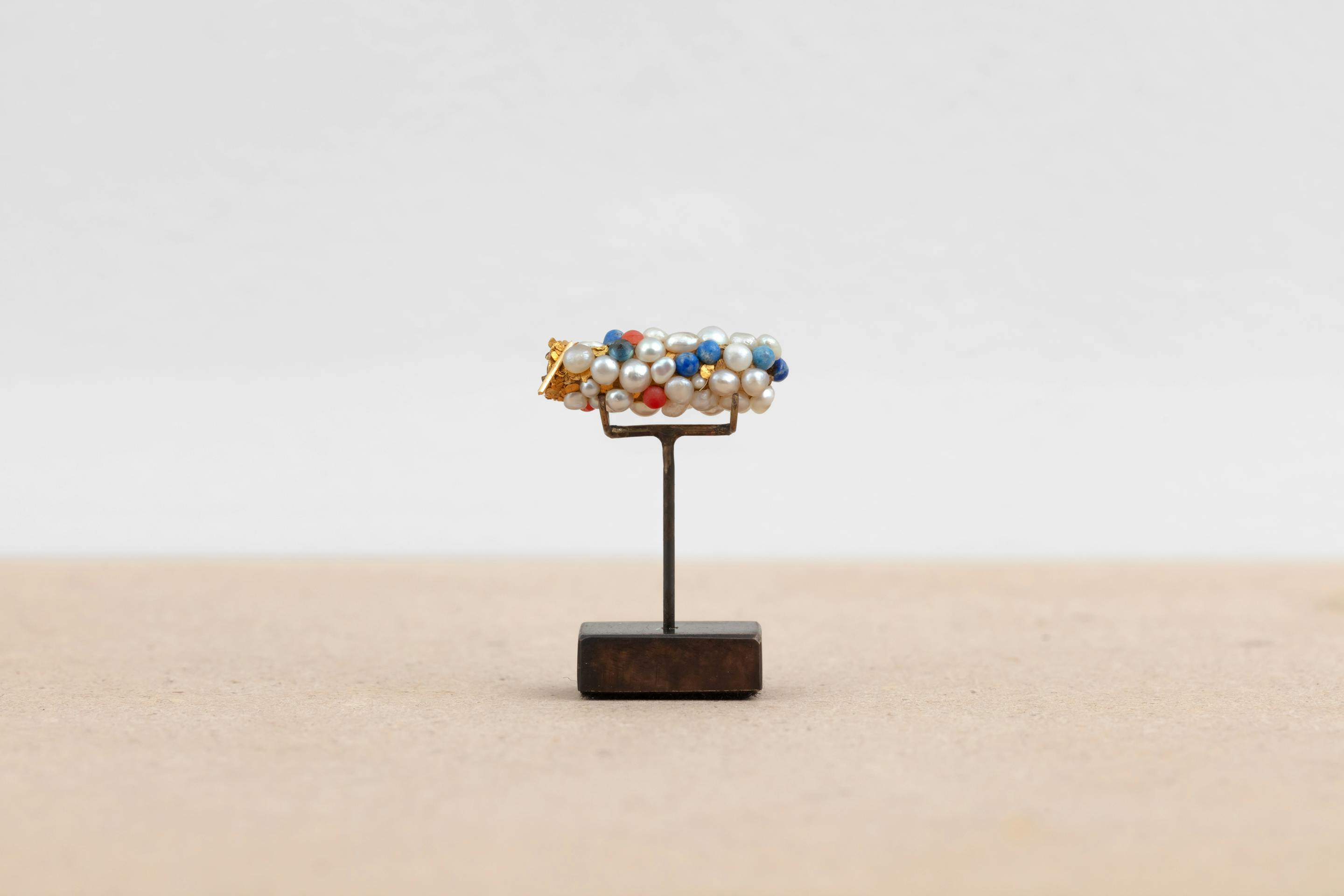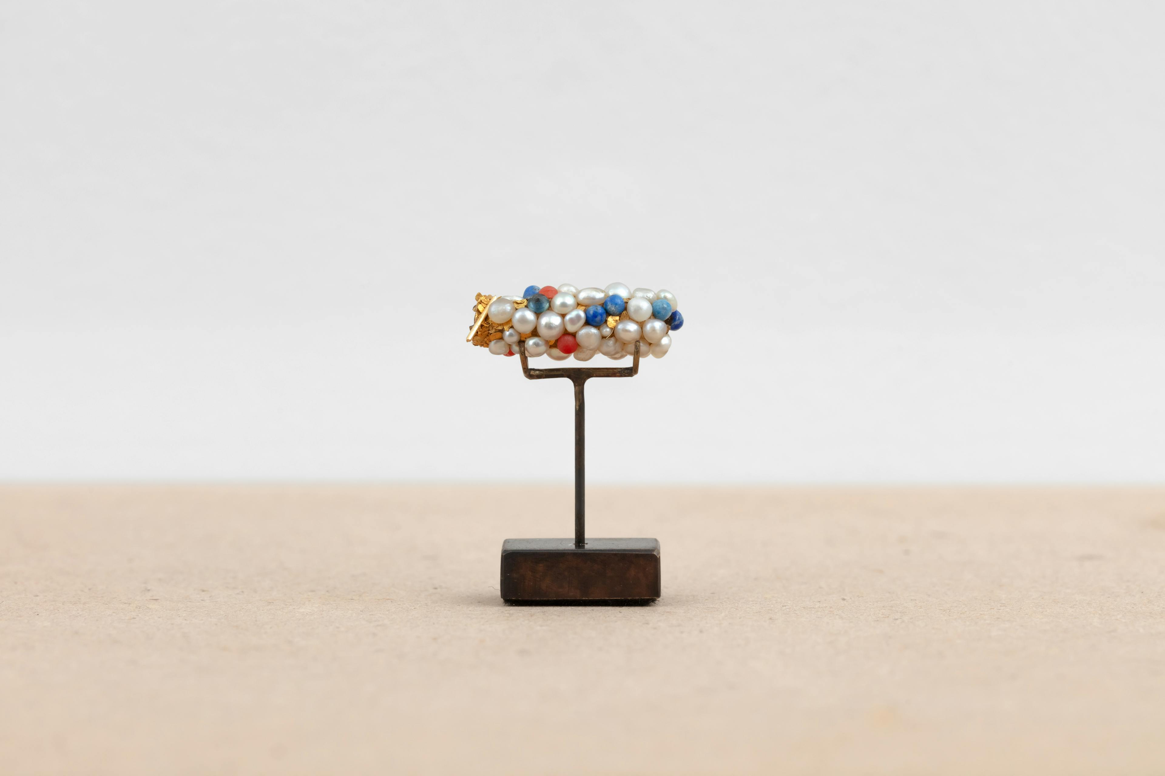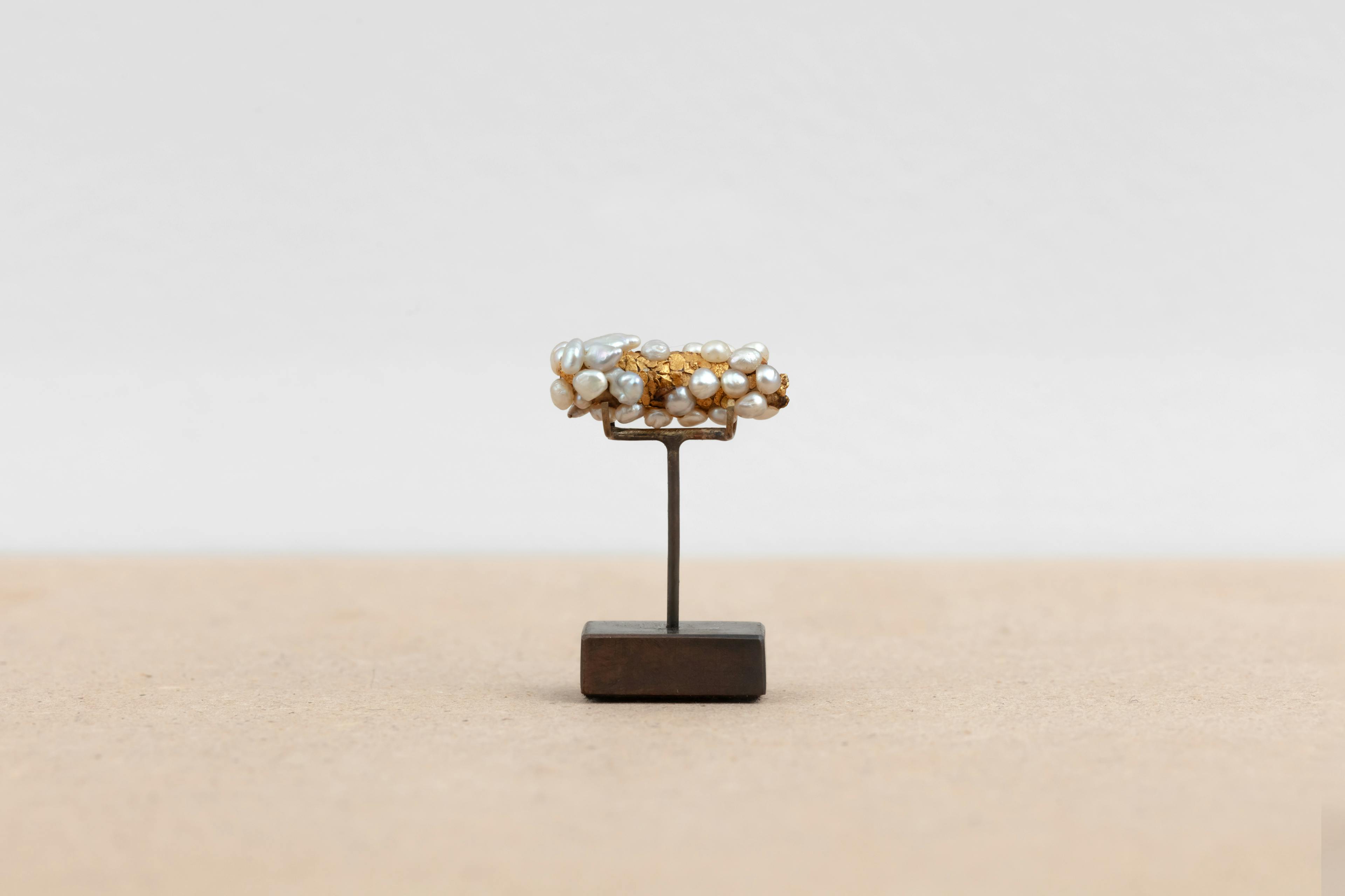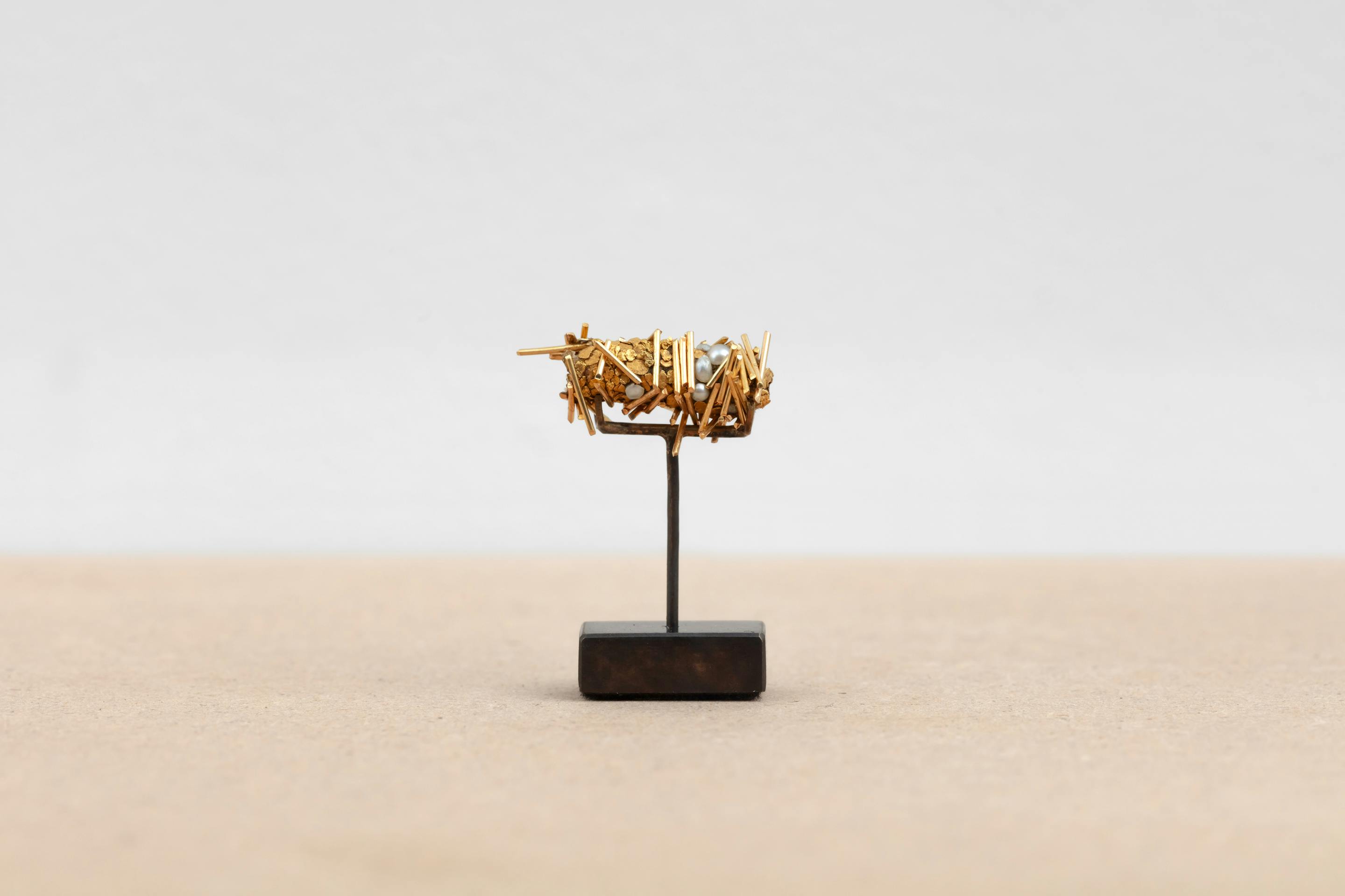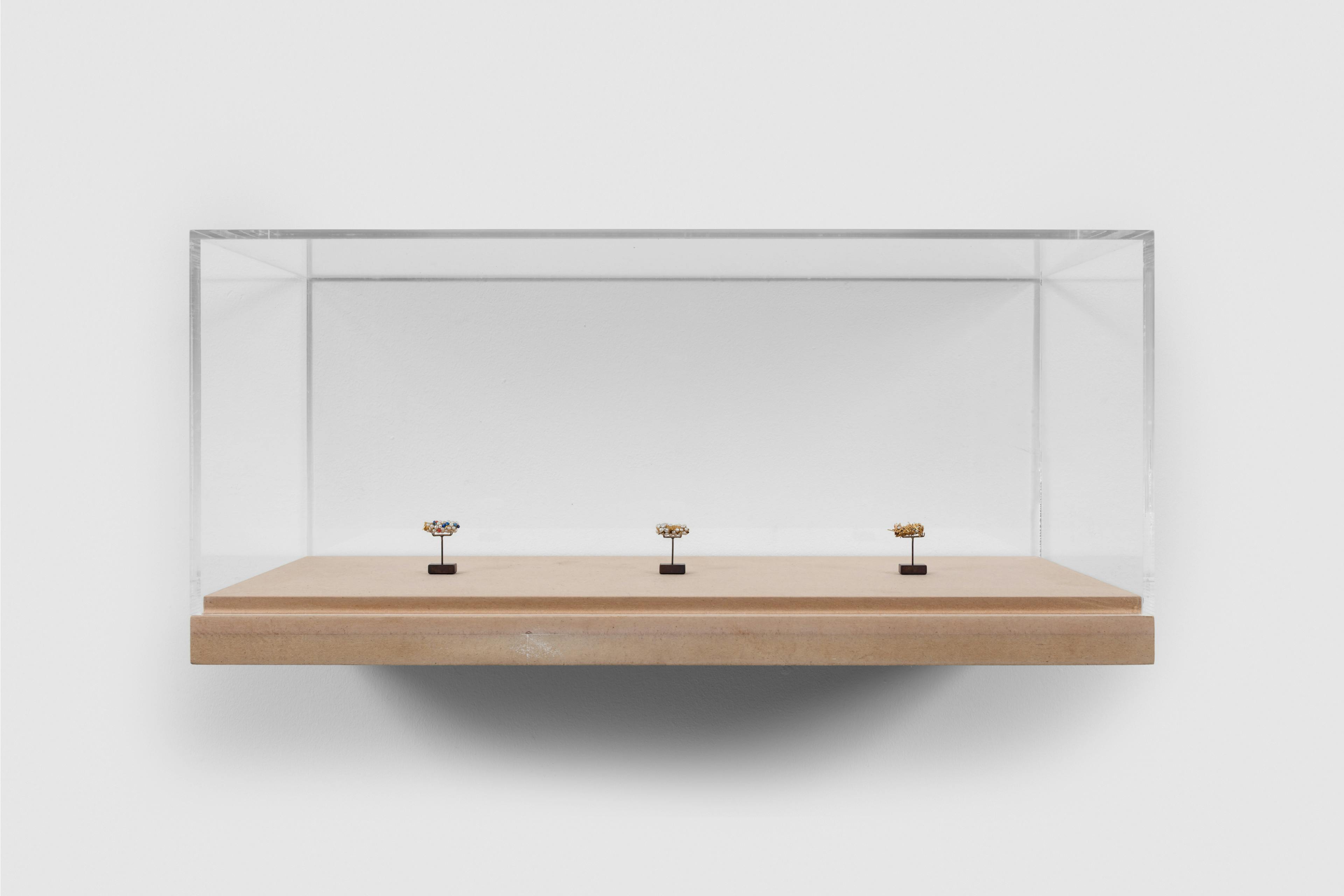 In his series Tube de tricopthère (ongoing since 1980), Hubert Duprat creates a device that conditions caddisflies (trichoptera) to use precious materials such as gold, pearls, rubies and diamonds instead of sand and twigs to build their armour, transforming these insects into ‘goldsmiths’.